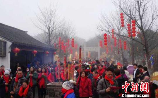 中新网南京2月12日电 (黄莹)“和台湾一样热闹,人山人海迎财神。”来自台湾新北市的石耀卿说。今年一家五口报了旅行团,和500名台湾游客一起踏上由金色元宝、古钱币、蝙蝠点缀,寓意富贵福瑞的红色财路,体验了一番别具江南水乡特色的接财神。