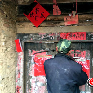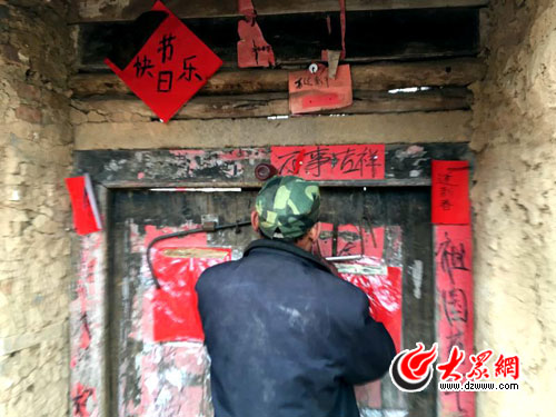 在楼堡的门上贴了一副对联,胡某某自言自语地说“日子刚好”(当地方言:意思是生活很美好)。大众网记者问对联是否是胡某某自己写的,他不好意思地笑了笑,说“是”。这幅对联没有用浆糊粘贴,而是直接“悬挂”在门框上的铁条上,上下联尺寸还不及A4纸大小,上联“迎新春”,下联“庆丰收”,门框以上用方红纸写着“节日快乐”,在楼堡三楼的外面还悬挂着一个旧灯笼,胡某某笑着称是为了过年喜庆。