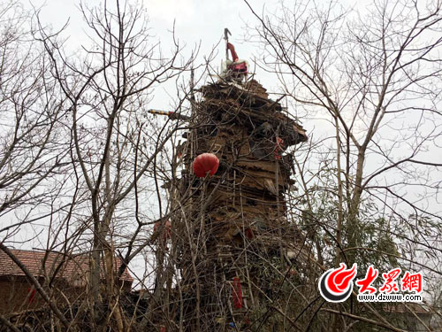 大众网记者在现场看到,楼堡所在的院里面杂草丛生,楼堡共7层,高约10米,借着原来一栋老房子的底座加固而成,整栋房子并没用水泥、钢筋、混凝土等建筑材料,而是全部由砖块、泥土以及废旧的圆木建成,不规则的金字塔状,愈往上愈细,非常简陋,大部分木棍和檩条端部裸露在墙外,东边是像脚手架一样扎起的“楼梯扶手”,楼梯直接就是用磨盘垒起来的。除了用木棍简单加固外,楼堡未做任何处理。大众网记者爬到“楼堡”内进行实地探访,发现只有二楼和三楼的室内放有用木棍搭起的简易床铺,再往上则空间越来越小,根本无法居住。这座摇摇欲坠的楼堡距离西侧的邻居不到20米。