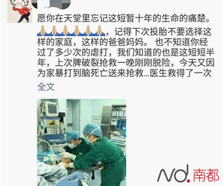 “我是用颤抖的手发这条微信的!小孩,我抢救了你一次,却无法改变你累受家暴的命运!……愿天堂无家暴!下次投胎做只快乐的小鸟!”