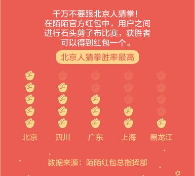 原标题:陌陌上女性用户抢到红包最多 北京人猜拳胜率最高