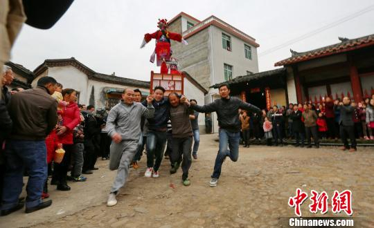 图为古事从小巷中狂奔而出。 黄水林 摄图为老人们抬着五谷真仙走进祖祠,祈祷风调雨顺。 黄水林 摄
