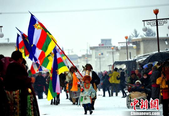 在格尔登寺,信教群众中彪悍魁梧的藏族汉子骑着经过精心打扮的高头骏马,排起长龙般的马队,彩旗飞扬气势壮观从寺院走过,纷飞的雪花,庄严的法号,整个现场沉浸在神秘的宗教氛围之中,随后的跳神活动,则将活动推向了高潮。