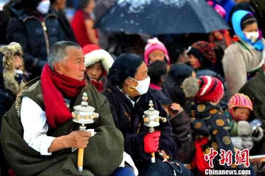 中新网阿坝2月21日电 (记者 安源)21日,四川阿坝县迎来一场瑞雪,该县格尔登寺在纷飞的雪花中举行一年一度的“莫郎节”活动。风雪没有阻止虔诚的脚步,一大早便有信众或是驾车,或是骑马,来到寺庙门口,等候活动的开始。
