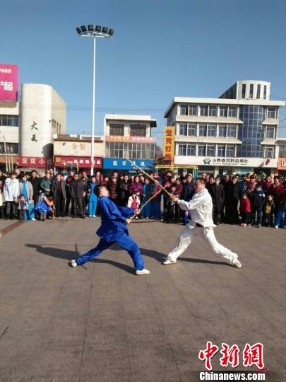 传承数百年的洪洞通背拳因拳法丰富,较难入门,爱好者虽众,却无人能坚持苦练。数年来,其第九代传人李果锁苦寻传人不得。图为在洪洞县22日举办的传统武术精品展示会上,两位洪洞通背拳爱好者在对练器械。 由受访者提供 摄