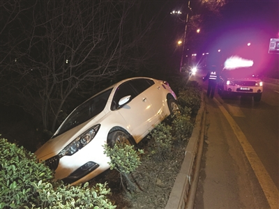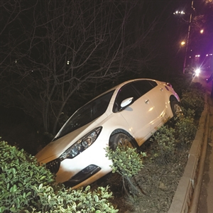 “咚!嘭!”昨日凌晨1时30分左右,南京玄武区沪宁高速连接线苜蓿园匝道口,一辆起亚轿车因车速过快,在转弯半径太大情况下,一头撞上绿化带后,紧接着右轮爆胎。令人吃惊的是,这辆起亚轿车当时并没有停下,而是一下子飞出15米后冲下护坡才停下。