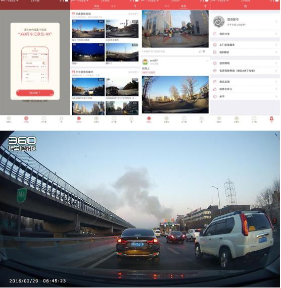 通过扫描包装上的二维码下载360行车记录仪APP,手机无线查找到设备即可实现无密连接,过程很简单。APP端界面主菜单设计清晰,功能分区明确。其中,“拍照”功能比较有趣,可以利用行车记录仪的摄像头拍摄照片,并储存在手机中,也可以通过360的“在路上”功能将照片上传,跟其他车友进行分享。通过手机可以查看到行车视频,十分方便。