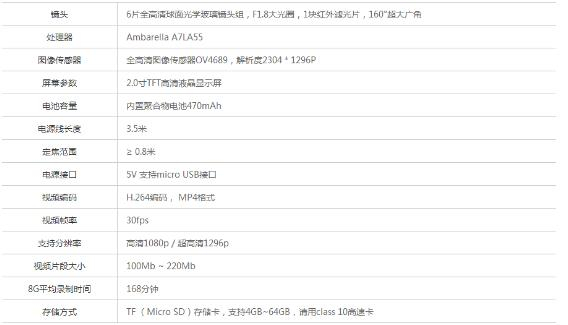 以上介绍了机器的硬件配置,接下来,让我们来看看这款机器的设备参数。360行车记录仪配置的全高清OV4698图像传感器,解析度为2304*1296P,超高清画质的画面更加清晰。镜头采用了六片全玻璃镜头,F1.8大光圈、160°超大广角的1296P摄像头,搭配安霸A7 LA55型号CPU,处理高清视频完全流畅。