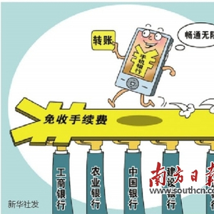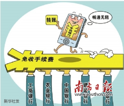今年2月25日,中国工商银行、中国农业银行、中国银行、中国建设银行、交通银行五家银行联合宣布,将陆续对客户通过手机银行办理的境内转账、汇款业务免收手续费,同时,5000元以下的境内人民币网上银行转账汇款也将免收手续费。