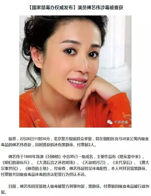 权威消息是这样的:昨天下午,国家禁毒委员会办公室微信公众号“中国禁毒”发布消息称,2月26日11时30分,北京警方根据群众举报,将在朝阳区亮马河某公寓内吸食毒品的傅艺伟查获,同时抓获的还有黑静环、付意敏两人。经审查,傅艺伟尿检呈冰毒阳性,本人对其容留黑静环、付意敏共同吸食毒品冰毒的违法犯罪行为供认不讳。