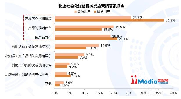 iiMedia Research(艾媒咨询)数据显示,产品的介绍和推荐、产品的促销信息和新产品的发布这三类产品相关信息受到移动社会化媒体用户的关注。其中,微博用户更注重产品资讯的获取,而微信用户更乐于参与互动。