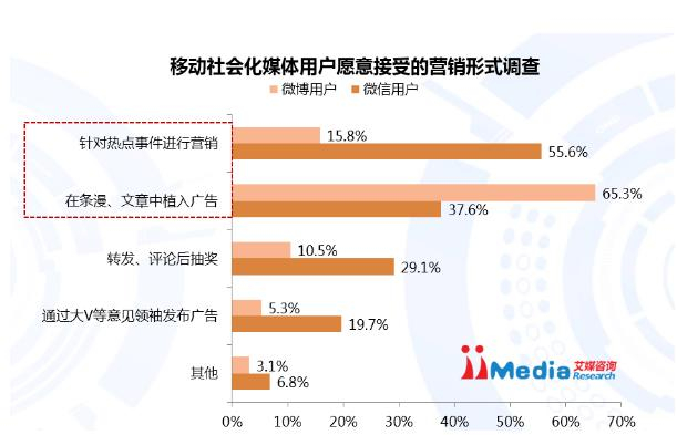 iiMedia Research(艾媒咨询)数据显示,针对热点事件展开的营销和在条漫、文章等植入广告的营销形式广泛受到微信和微博用户的接受。因此,热点营销和原生广告是移动社会媒体营销的发展重点。