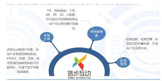 基于创新、技术和策略的品牌传播公关,信步互动专注于不尴尬、重场景、有创意、有数据和重效果的互动营销整体解决方案。其核心理念为注重效果,融合科技和创意。信步多屏互动游戏平台,开创了线下营销的场景革命。