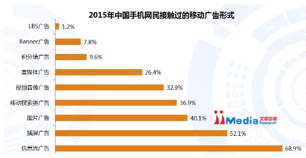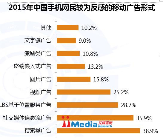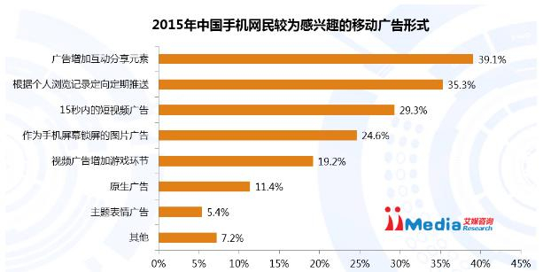 iiMedia Research(艾媒咨询)数据显示,互动分享(39.1%)、定向推送(35.3%)和短视频广告(29.3%)是中国手机网民较为感兴趣的移动广告形式。