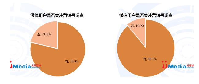 iiMedia Research(艾媒咨询)数据显示,大部分移动社会化媒体用户关注了品牌营销号。其中,微信用户关注率比微博用户稍高。分别有89.1%的微信用户和78.9%的微博用户关注了品牌营销号。