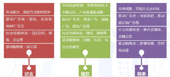 现阶段,移动营销进入高速增长期,营销形式逐渐多样化,社会化媒体营销、移动整合营销、移动大数据营销及程序化购买成为关注重点。利用移动互联网的私人性和场景化等优势,通过大数据技术对用户信息进行全面有效的利用,整合各种生态资源,构建更完整的移动营销生态链。