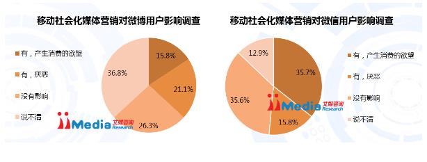 iiMedia Research(艾媒咨询)数据显示,目前移动社会化媒体营销效果并不显著。只有15.8%的微博用户和35.7%的微信用户会因为移动社会化媒体营销产生消费的欲望,21.1%的微博用户和15.8%的微信用户会因为移动社会化媒体营销而厌恶该品牌。