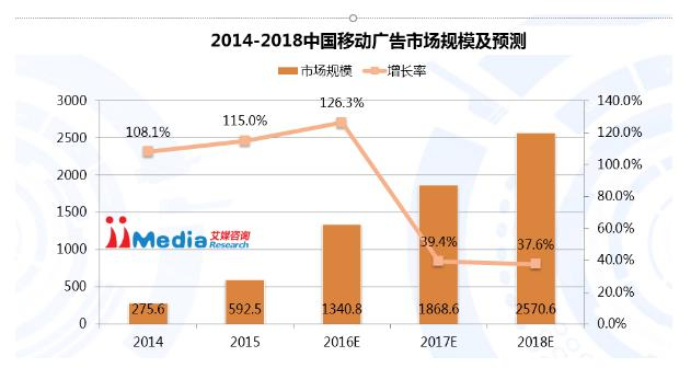 iiMedia Research(艾媒咨询)数据显示,从2014年起,移动广告市场增速均保持在100%以上,2015年市场规模达592.5亿元。预计2018年中国移动广告市场规模将超过2500亿元。