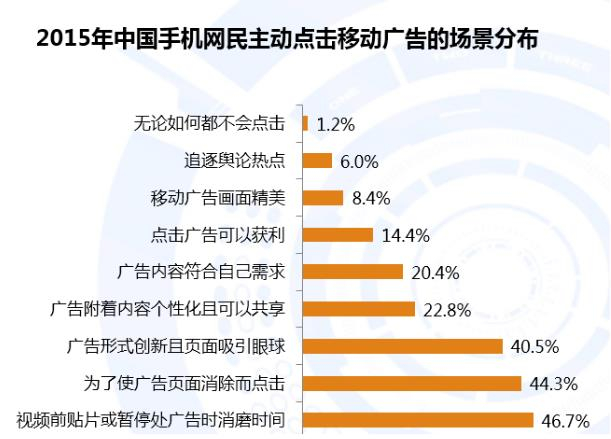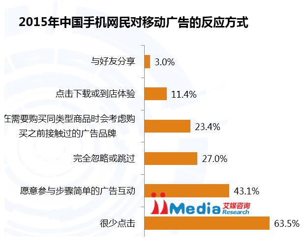 iiMedia Research(艾媒咨询)数据显示,63.5%的中国手机网民很少主动点击移动广告,但仍有43.1%的用户愿意参与步骤简单的广告互动。广告形式的互动性,广告内容的个性化和可分享功能是吸引手机网民主动点击移动广告的主要因素。