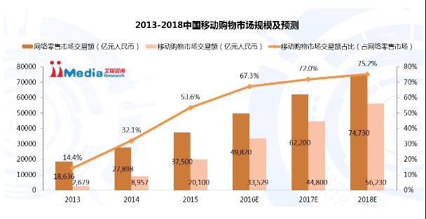 近年来,中国移动购物市场交易额稳定增长,占整体网络零售市场交易额的比例不断上升。艾媒咨询分析师认为,2015年中国移动端交易额将首次超过PC端,占网络零售市场总交易额的50%以上。