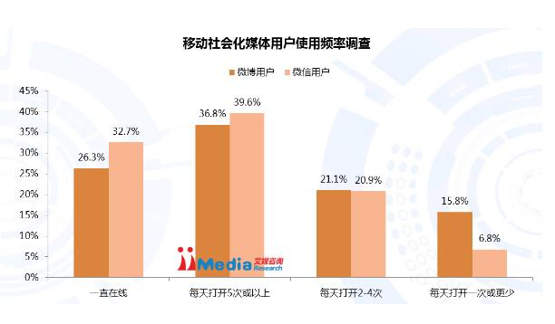 iiMedia Research(艾媒咨询)数据显示,微信用户的使用频率高于微博用户。由于微信较强的社交属性,32.7%的微信用户倾向于保持一直在线,而只有26.3%的微博用户选择一直在线。