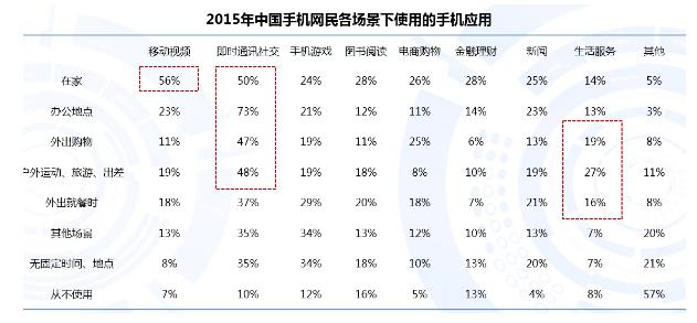iiMedia Research(艾媒咨询)数据显示,在家观看移动视频的用户占中国手机网民总数的56%,即时通讯社交应用的使用场景分布较广,生活服务类应用在外出购物、户外运动、旅游、出差与外出就餐等场景下的使用频率较高
