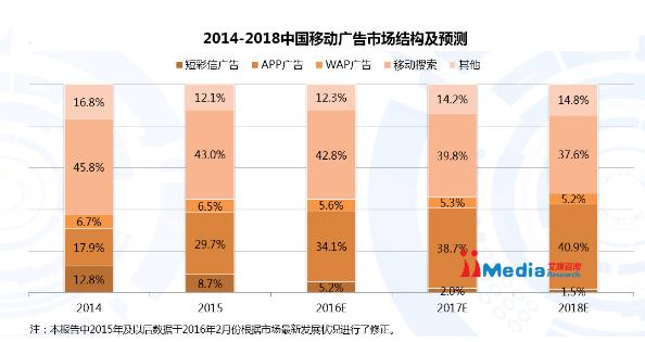 iiMedia Research(艾媒咨询)数据显示,移动广告市场中短、彩信广告占比逐年下降,预测到2018年仅剩1.5%,短、彩信广告将逐渐退出舞台。另一方面,移动搜索广告和APP广告发展迅猛,艾媒咨询分析师预测,到2018年,移动广告市场将主要由APP广告(40.9%)和移动搜索广告(37.6%)构成。