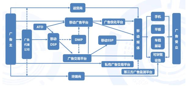 通过RTB进行广告交易是移动程序化购买中较为常见的模式,RTB中包括广告主、DSP、广告交易平台、SSP、DMP等多个参与主体。DSP平台收集广告主的广告需求,互联网媒体将自己的广告流量资源提交到SSP,DSP和SSP通过与广告交易平台的技术对接的方式完成RTB竞价购买整个过程。
