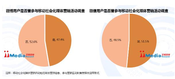 iiMedia Research(艾媒咨询)数据显示,2015年只有大约5成的用户参与过移动社会化媒体营销活动。其中,有51.5%微信用户参与过移动社会化媒体营销活动,微博用户参与营销活动比例稍低一些,占到47.4%。