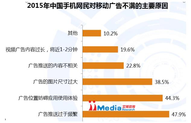 iiMedia Research(艾媒咨询)数据显示,搜索类广告(38.9%)是中国手机网民最为反感的移动广告形式,其次为社交媒体信息流广告(35.9%)。广告推送频率过高和妨碍应用使用是造成手机网民不满的主要原因,分别有47.9%和44.3%。