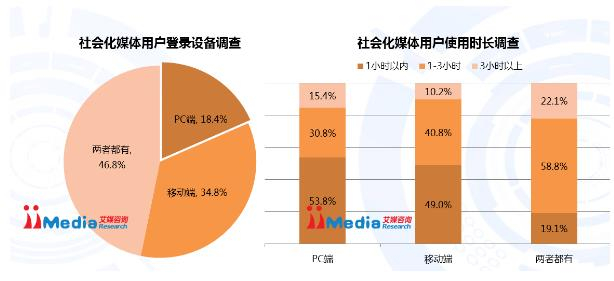 iiMedia Research(艾媒咨询)数据显示,只有18.4%的社会化媒体用户仅使用PC端登录账号,接近半数社会化媒体用户同时使用PC端登录账号。跨屏用户的平均使用时长要高于仅在PC端或仅在移动端登录的用户。