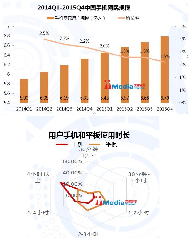 随着智能手机的普及、移动基础设施的完善,互联网用户开始向移动端迁徙。iiMedia Research(艾媒咨询)数据显示,2015年中国手机网民规模达6.79亿人,其中超过40%的手机用户日均使用时长达到4小时以上,用户与移动终端设备的亲密度加深.