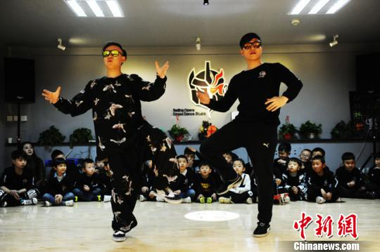 5日,中新网记者在徐晓鹏和李昊新成立的“粉墨嘻哈”工作室看到,30多名小学员正在他们的指导下,随着音乐热舞,既透出嘻哈机械舞特有的“韵律”,又不乏京剧中“手、眼、身、法、步”的架势。
