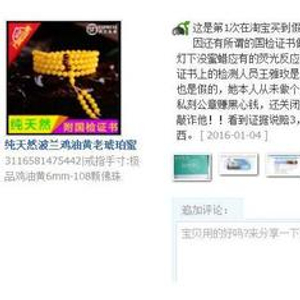一位消费者在淘宝购买到一款蜜蜡手串,收货后经查验发现,随手串附带的珠宝鉴定证书为假证书,上面的检测人员姓名和检测中心网址以及公章都是伪 造的。这位消费者在差评投诉2天内,此商品下架了,但几天后,商家把之前的销售记录全部清零重新上架。消费者举报给淘宝后,客服人员却仍称证据不足。(图 片为:蜜蜡手串评论;聊天记录;买的这款蜜蜡的假证书;又上架了的图片)