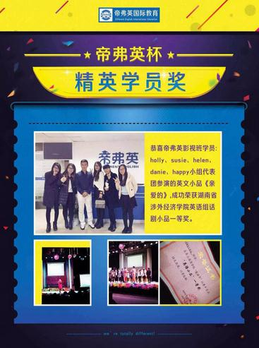 吴路遥,英文名Helen,帝弗英影视班学员,在2015年湖南涉外经济学院“世纪讲坛”比赛中带领所属的小组获得一等奖!同时获得一等奖的还有帝弗英影视班学员:Holly、Susie、Danie、Happy!