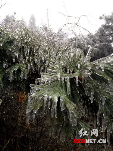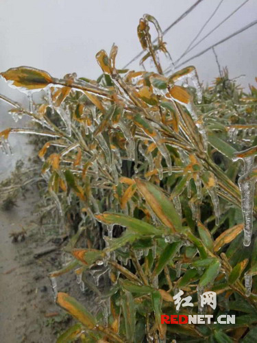 隆回小沙江的竹子被冰凌压弯了腰,像是“低头作揖”。