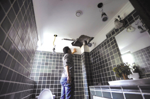 精装样板房,为何会出现这么严重的漏水情况?王先生给记者出示了一张照片,这是物业将他家卫生间吊顶打穿后,他拍下的。照片显示,3楼业主卫生间的地漏并没有连接落水管,而是直接往下流到2楼吊顶处。