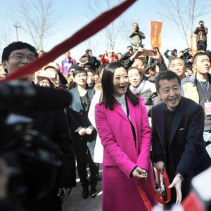 贾樟柯10日为贾家庄三晋民俗文化体验地贾(gǔ)街揭匾。 韦亮 摄贾樟柯10日在汾阳宣布兴建贾樟柯艺术中心,图为贾樟柯和妻子在贾(gǔ)街。 韦亮 摄