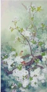这些看似西画风景图式的工笔画,在传统花鸟画的平面性特征上彰显出特有的审美质感。作者对景观中花与鸟的意趣及境界的提炼,并非简单再现自然花鸟的生态,而总是力求描绘花与鸟具有的某些人性化的情感与情调,浓烈地呈现出画家对生活中诗情画意的提炼与生命意识的渲染,散发出传统花鸟画典雅精致的芬芳。他以多层渲染、积染形成富有深度的空间,形成了影影绰绰、迷迷蒙蒙的花形鸟影,造成画面前后丰富多变的景深,使他的花鸟画更具有诗情画意,既充分运用光晕来自由改变画面整体的晦明变化,也成功地将传统工笔画的晕染、分染、接染和罩染等染法和传统勾线的运用发挥到一个新的境界,贴近了人们当代性的视觉经验。他对光晕景深的新探索是以诗意的营造为灵魂的。这种光晕的景深总是为迷离的烟雨、朦胧的月色而制造,使人睹画有月笼潇湘、雾锁花苑之感;画面上的花瓣花萼、花枝花叶又总是通过细腻而简约的描绘,呈现出苞蕾含露、欲绽还羞的情态。