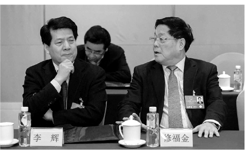 李辉代表(左)与修福金代表(右)交流。 正义网记者程丁摄