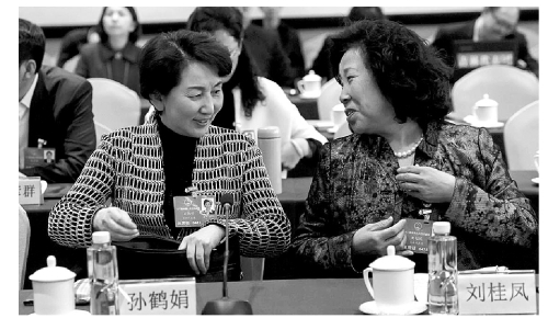 孙鹤娟代表(左)与刘桂凤代表(右)交谈。 正义网记者程丁摄