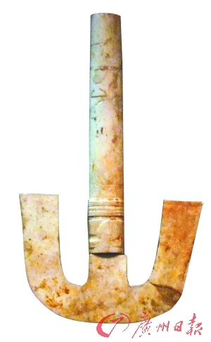 三叉形器,因器物上上端并列有三个支叉的造型而得名,在墓葬中往往安置于死者的头部。良渚文化早中期的三叉形器,中叉明显低于两侧之叉,出土时,部分中叉上还相接一根长玉管,在形态上与铜镜上的“山”形纹几乎一模一样。