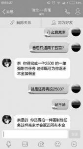 华商报记者从小王提供的聊天截屏看到,小赵说她已经没钱了,能不能把支付的钱退回来,对方说因没完成这单任务,所以无法提交也就无法退钱,并让小赵想办法周转一下。“你给我一个保证,我再凑钱,我还是个学生,不可能赔了学生的钱还赔朋友的。”小赵说。“亲,我们现在拍的是京东,京东你有听过骗人吗?”对方开始拿京东说服小赵。