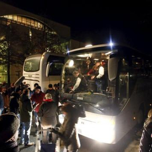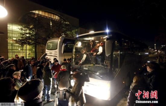 资料图:当地时间2016年1月14日,德国柏林,德国巴伐利亚州州长Peter Dreier将一辆载满31名难民的大巴开到首都柏林默克尔的办公室,对德国难民政策表示抗议。