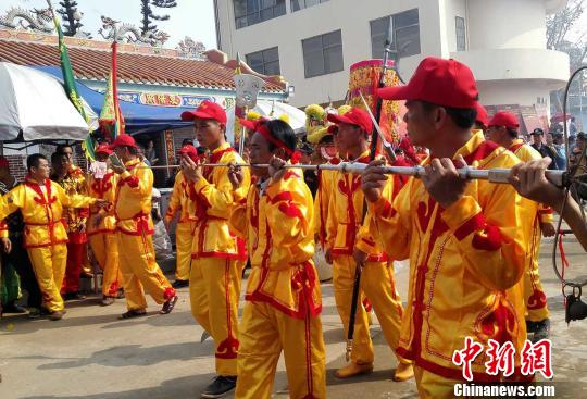 活动上演穿杖等民俗活动。 张茜翼 摄黎苗族同胞盛装参与装军巡游。 张茜翼 摄
