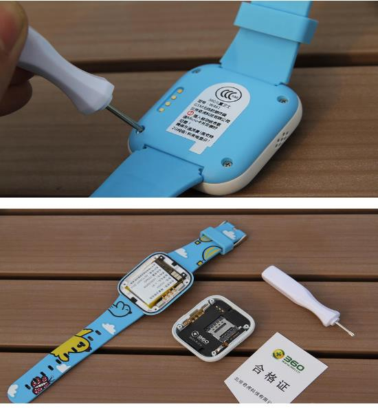 手表使用MicroSIM卡,仅支持移动、联通的GSM网络,暂不支持电信卡,在安装SIM卡时必需先松掉四颗固定螺丝,可通过配件中赠送的螺丝刀对其拆卸,这样既能密封防水,又能防止孩子意外打开手机壳而造成手表失效无法联系的情况。