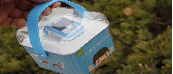 360儿童手表3采用小提篮式的礼盒包装,全透明橱窗式上盖,从外部可直观看清手表主机外观,产品的功能介绍以卡通图案的方式环绕在包装盒四周,会第一时间吸引孩子的眼球。