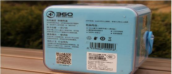 在包装盒的底部印有360儿童手表3的功能介绍、条形码、二维码以及产品的相关信息。