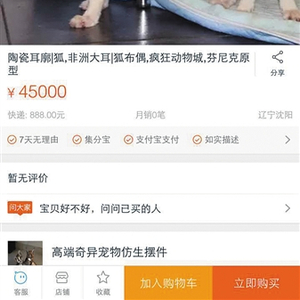 昨日上午,某网络购物平台一家网店标出“疯狂动物城芬尼克”原型,非洲大耳,45000元。网络截图
