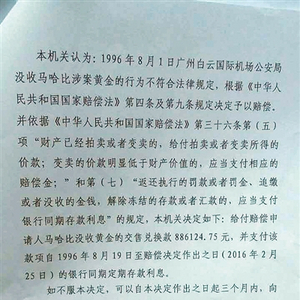 日前,马哈比收到了广东省公安厅机场公安局2月28日出具的《行政赔偿决定书》。根据决定书,1996年8月1日,广州白云国际机场公安局对马哈比私自购买黄金的行为处以没收涉案黄金9350克的处罚后,按规定将没收的黄金交售中国人民银行广州市分行,交售兑换886124.75元,9月5日,将涉案黄金交售款上缴广州市财政局。